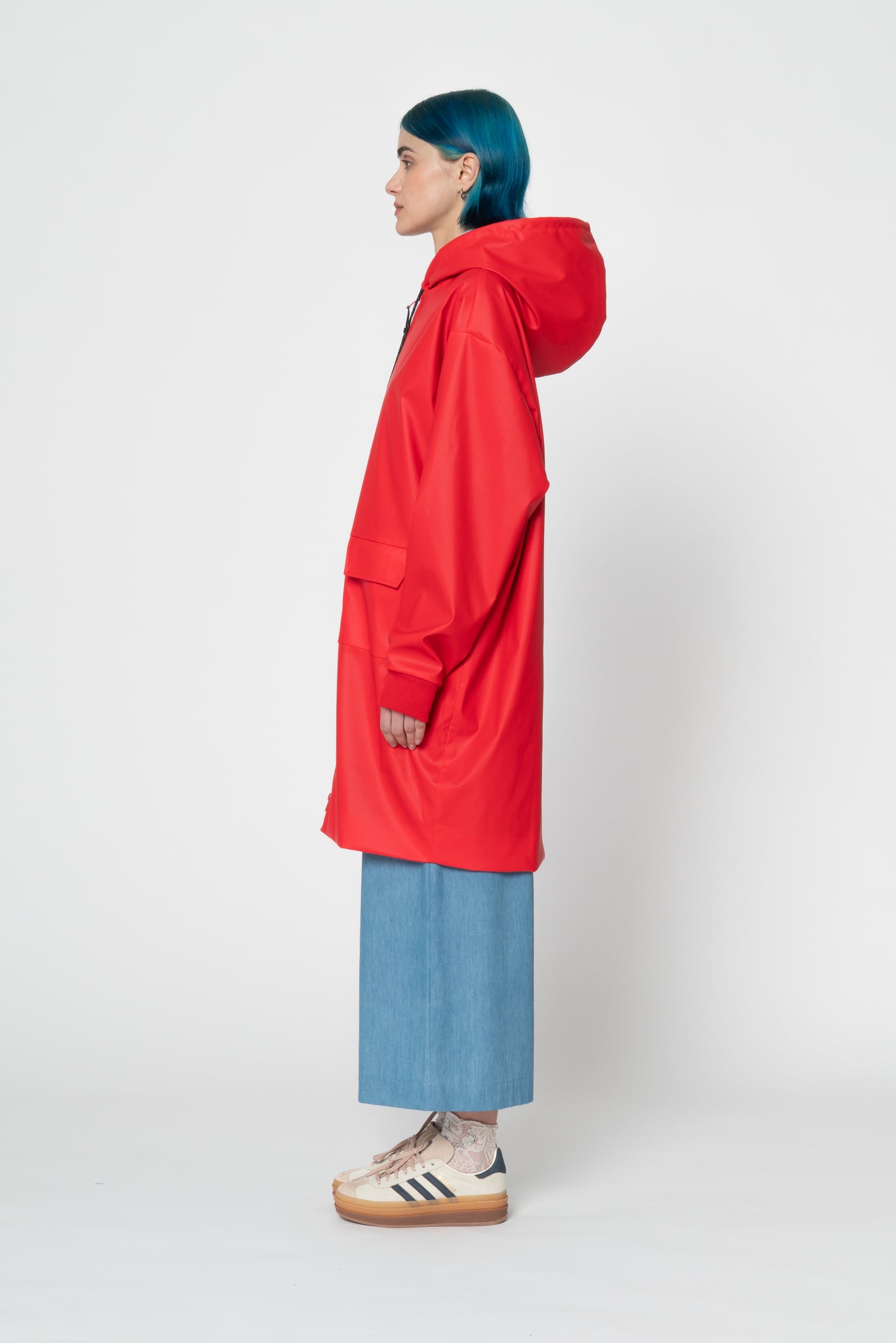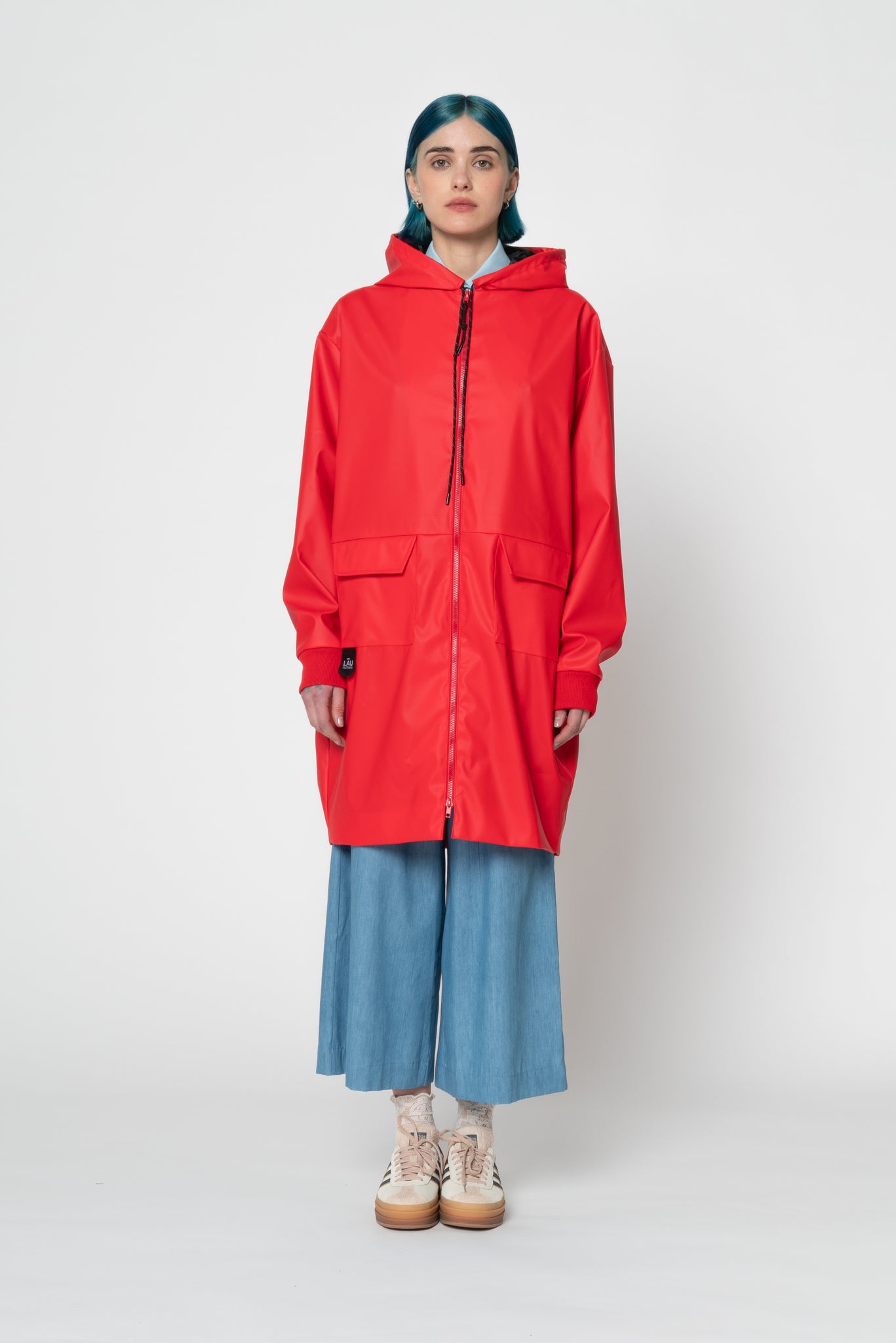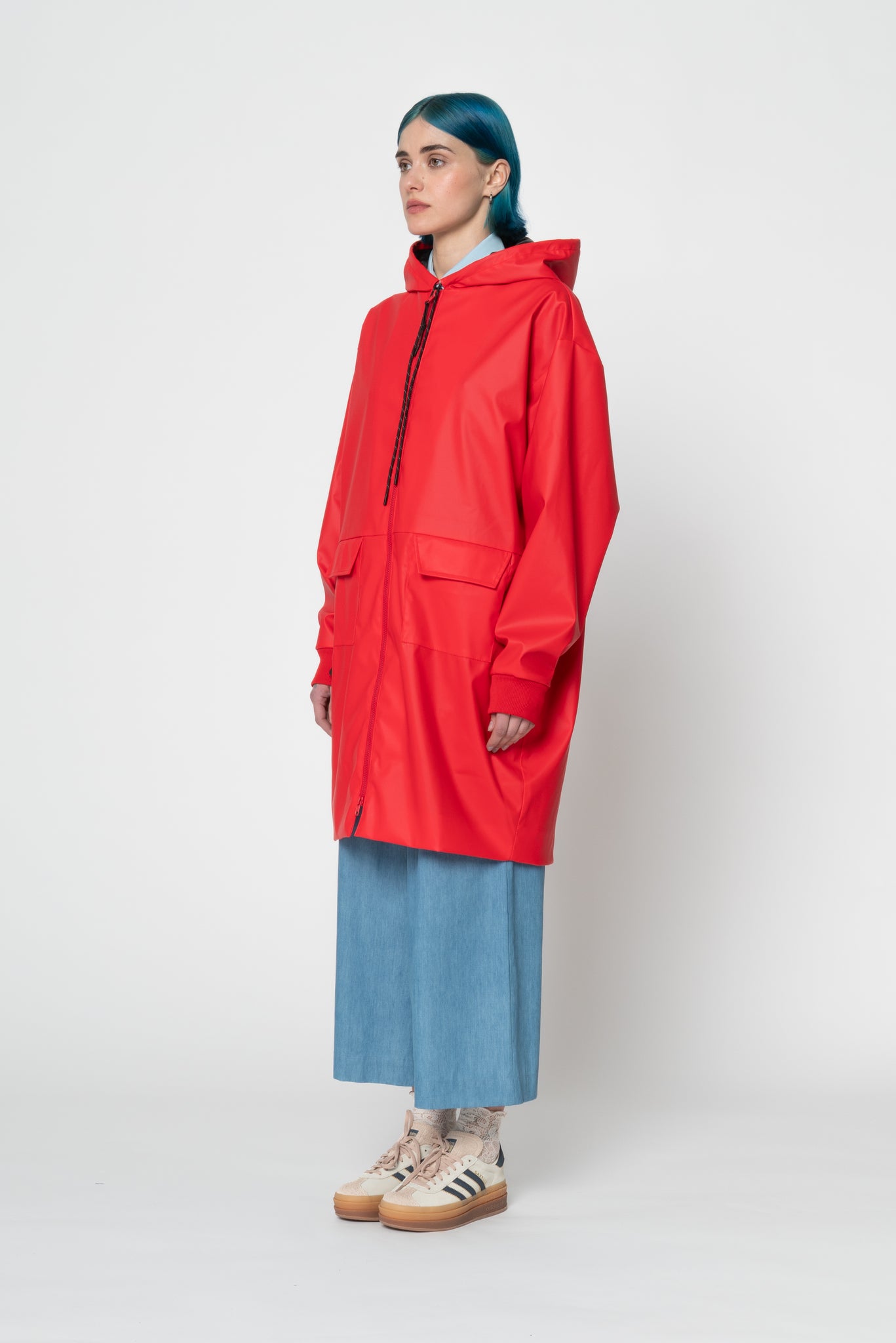 Waterproof light rubber fabric raincoat. Unisex and oversize style. Hood with adjustable laces, pockets on the front, dropped shoulders. Elastic spareribs cuffs. Internal lining, double slider zip. Size Small fits as a small for men.