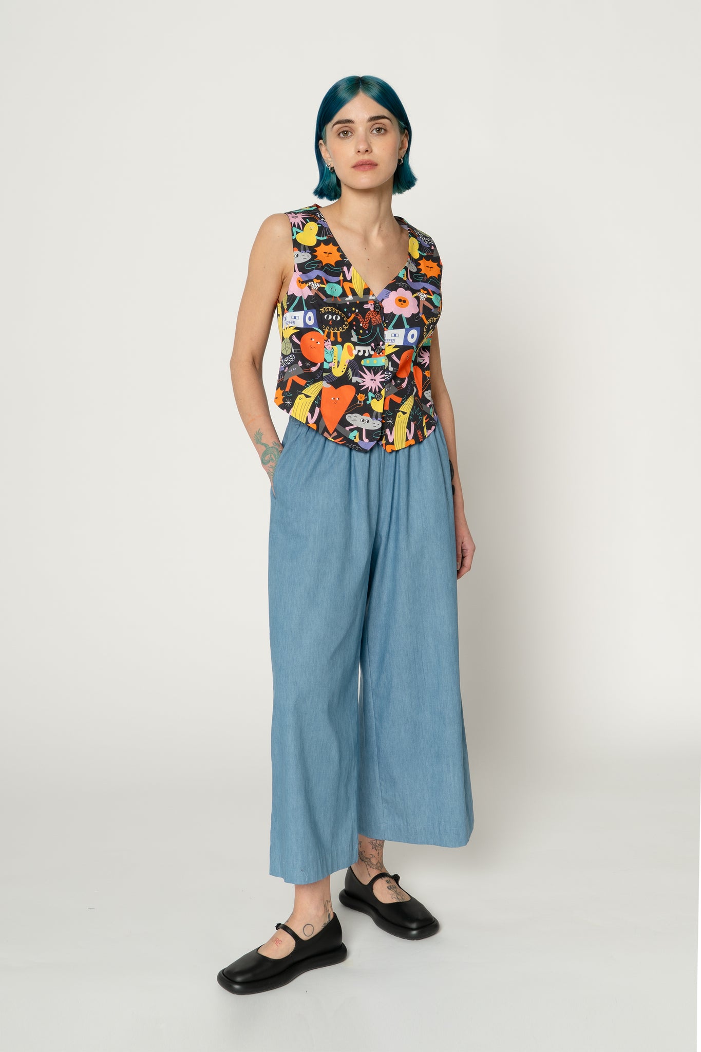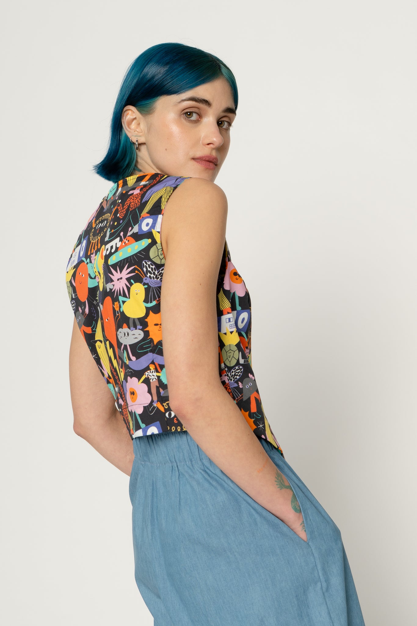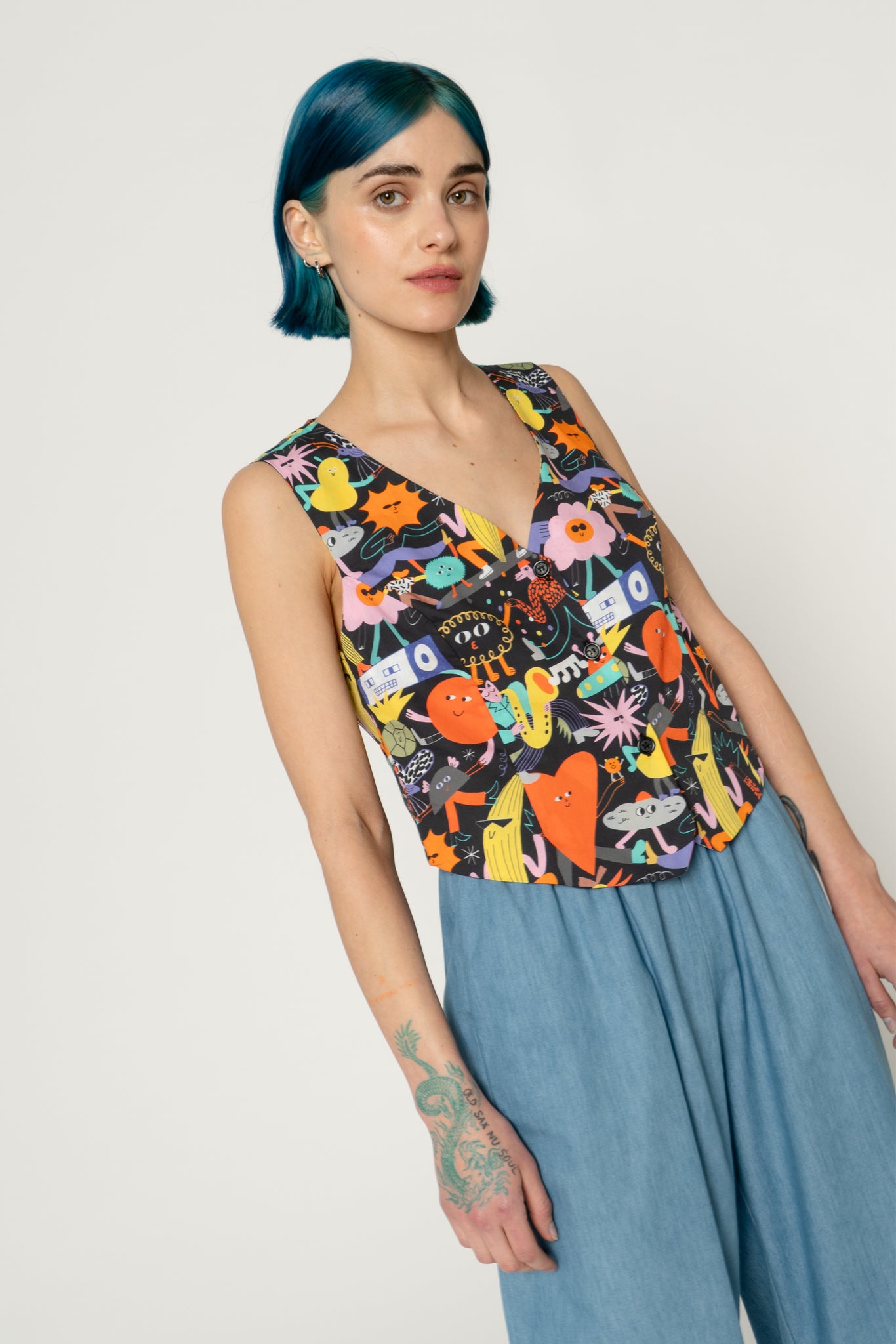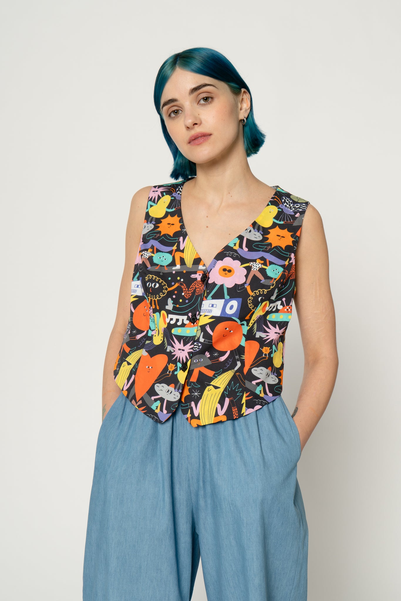 Printed tank top vest with V neck. Buttons open on the front, shaped bottom edge on the back. It could be worn as a tank top with an high waist pant or with a t-shirt or shirt below as an accessory garment. Print design by Dans Les Dents.