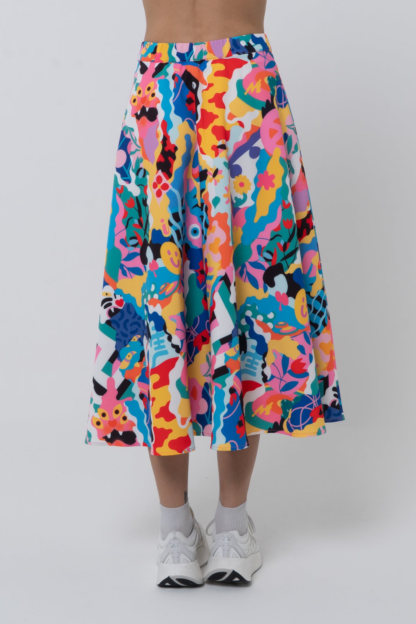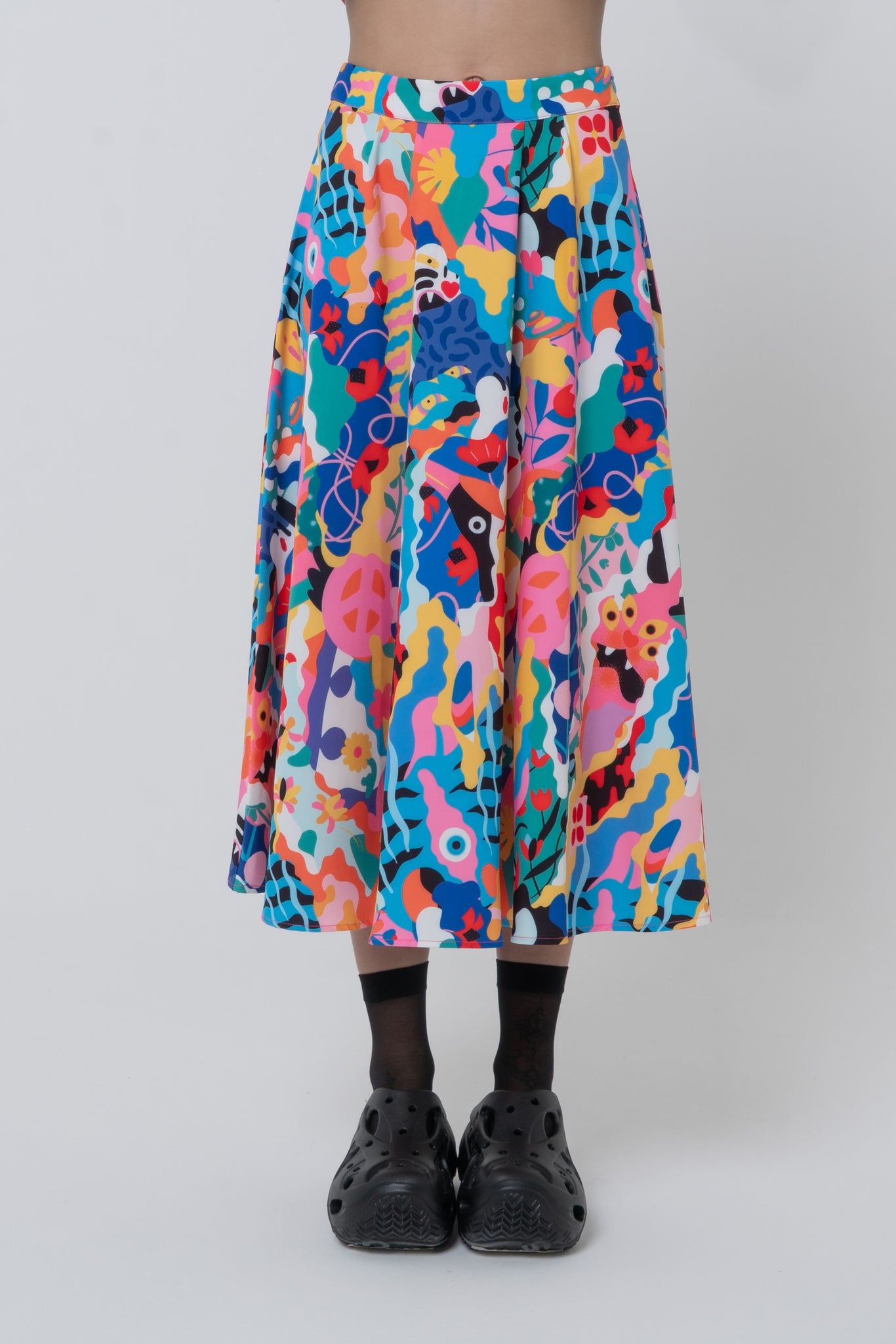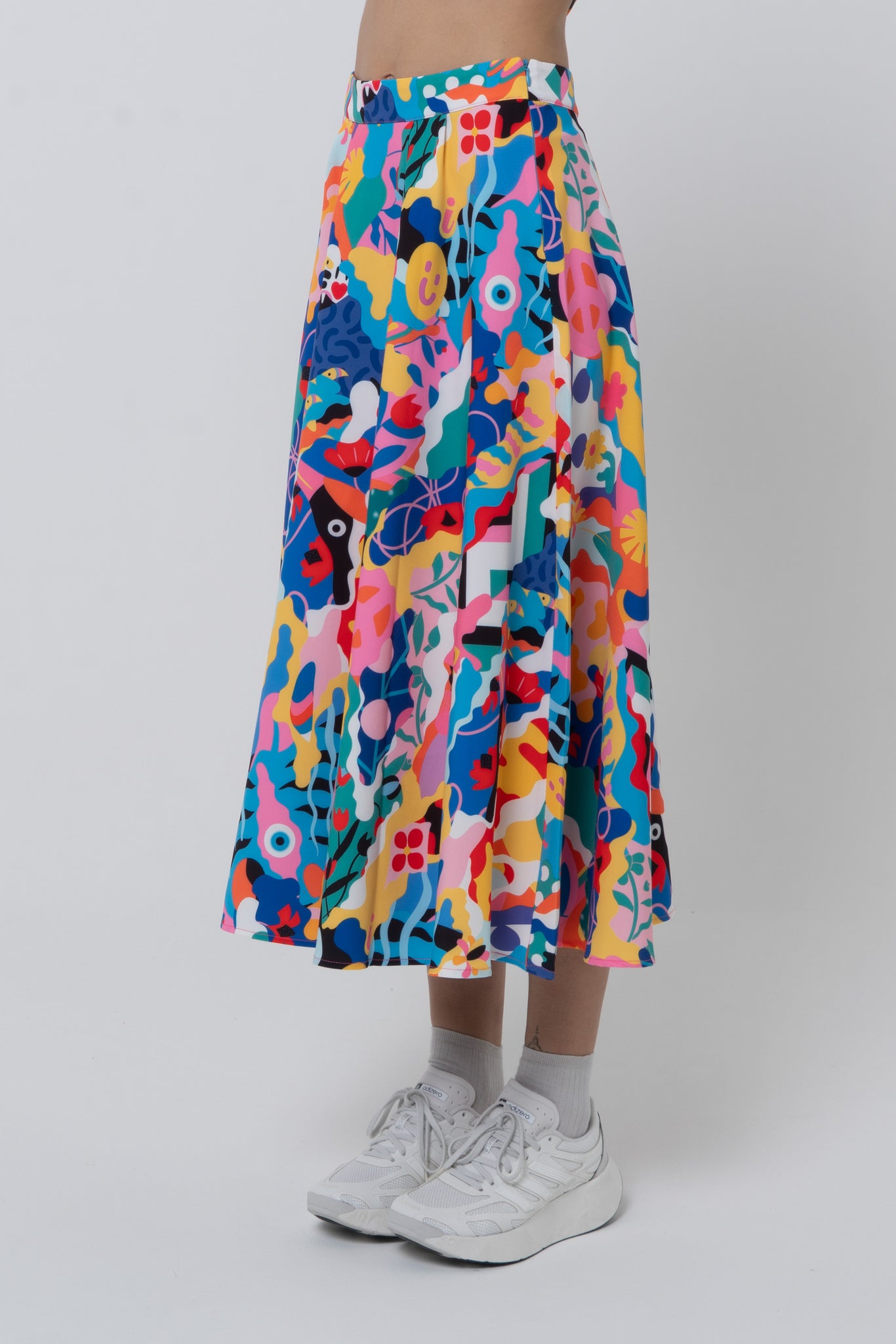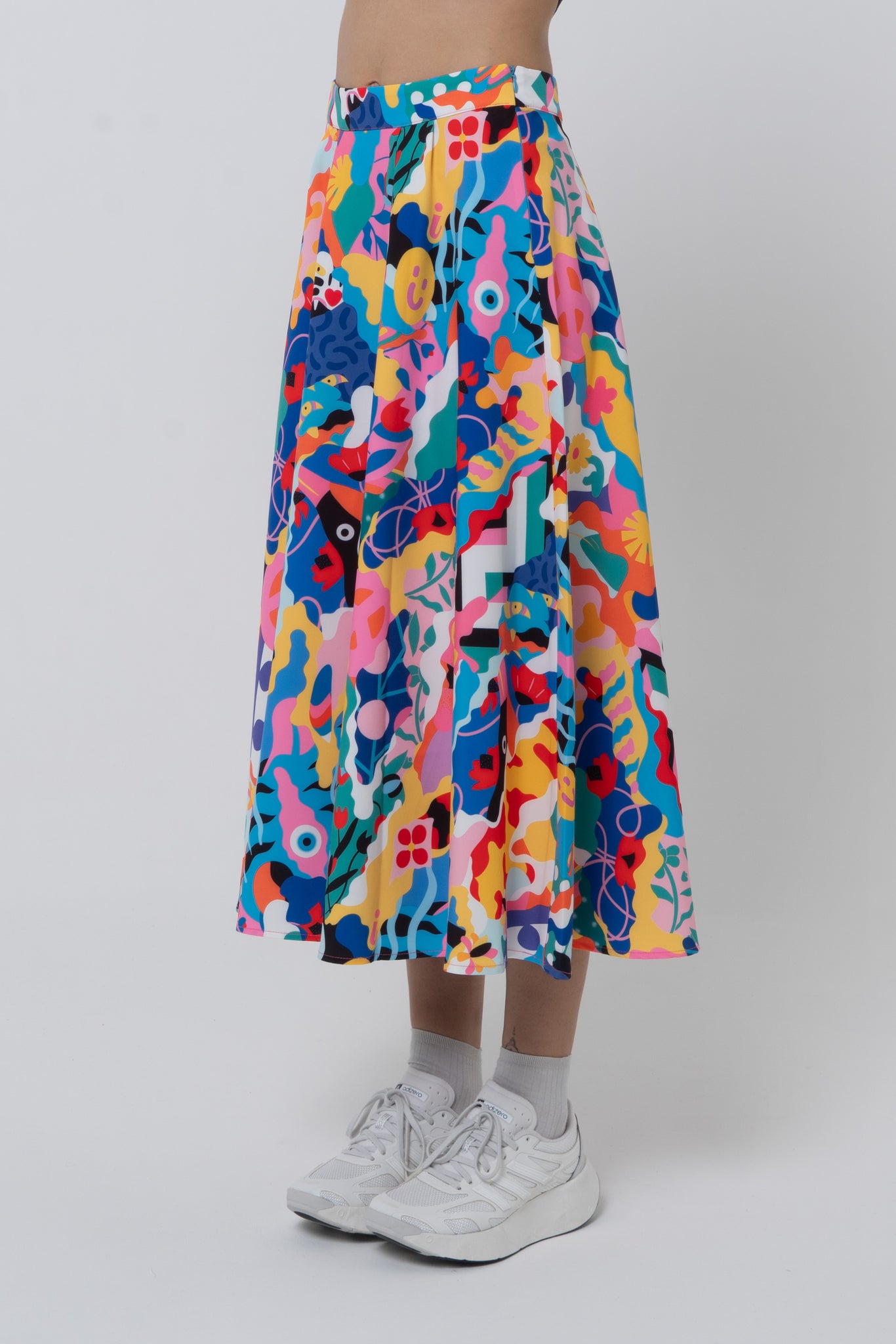 Long and wide full skirt made of a fluid mid weight cady fabric. Pinces on the front, zip closure on a side. Print design by Brolga.