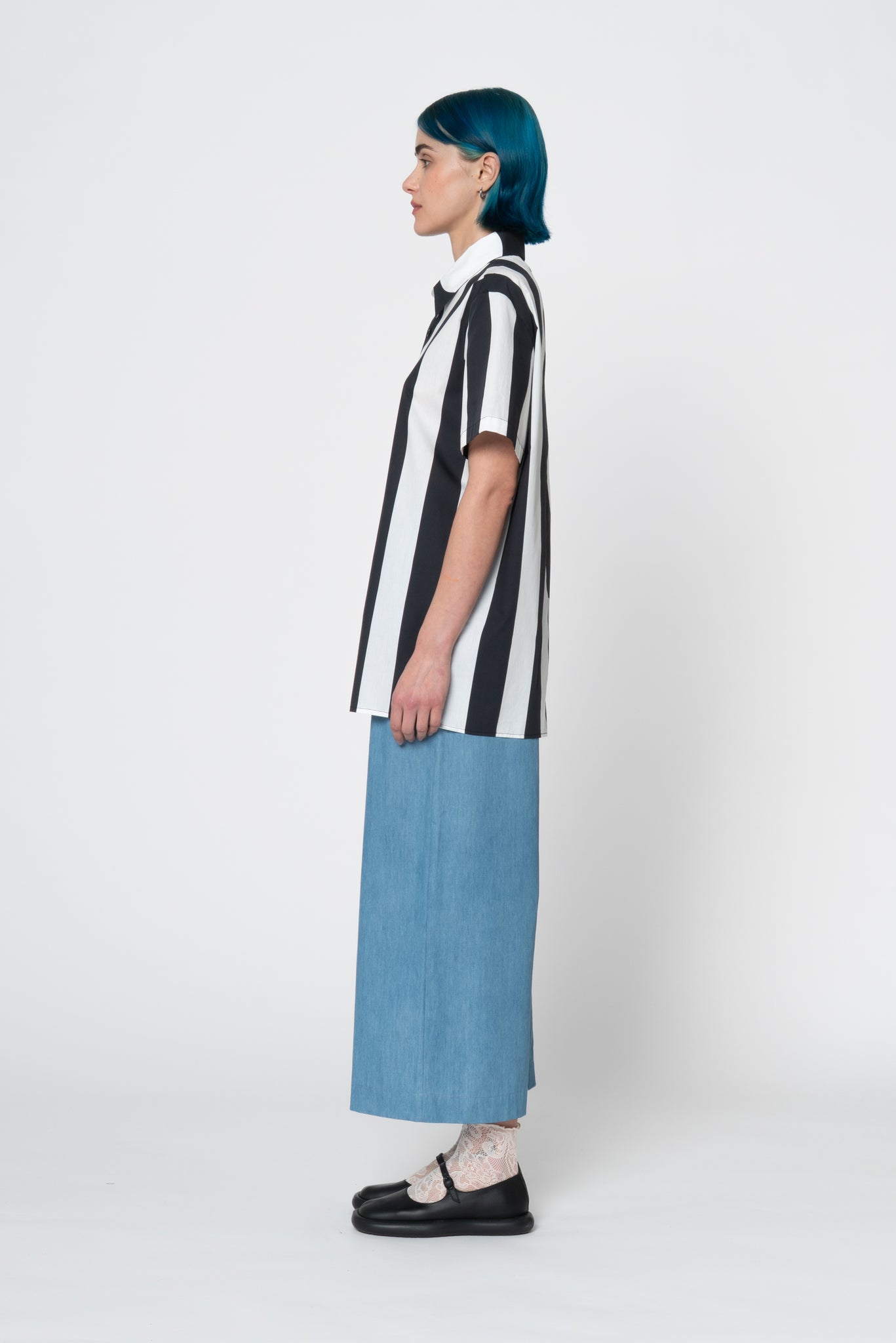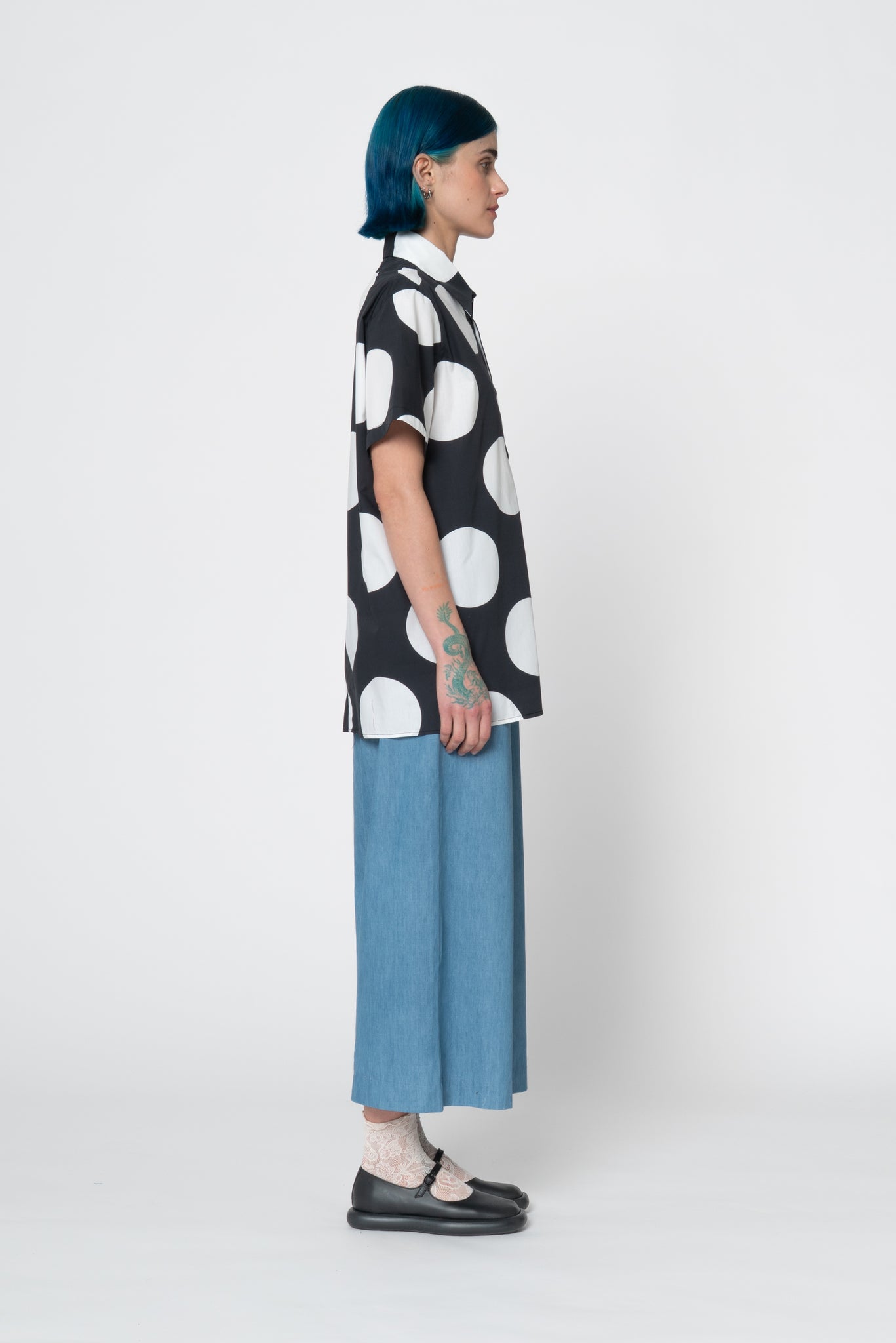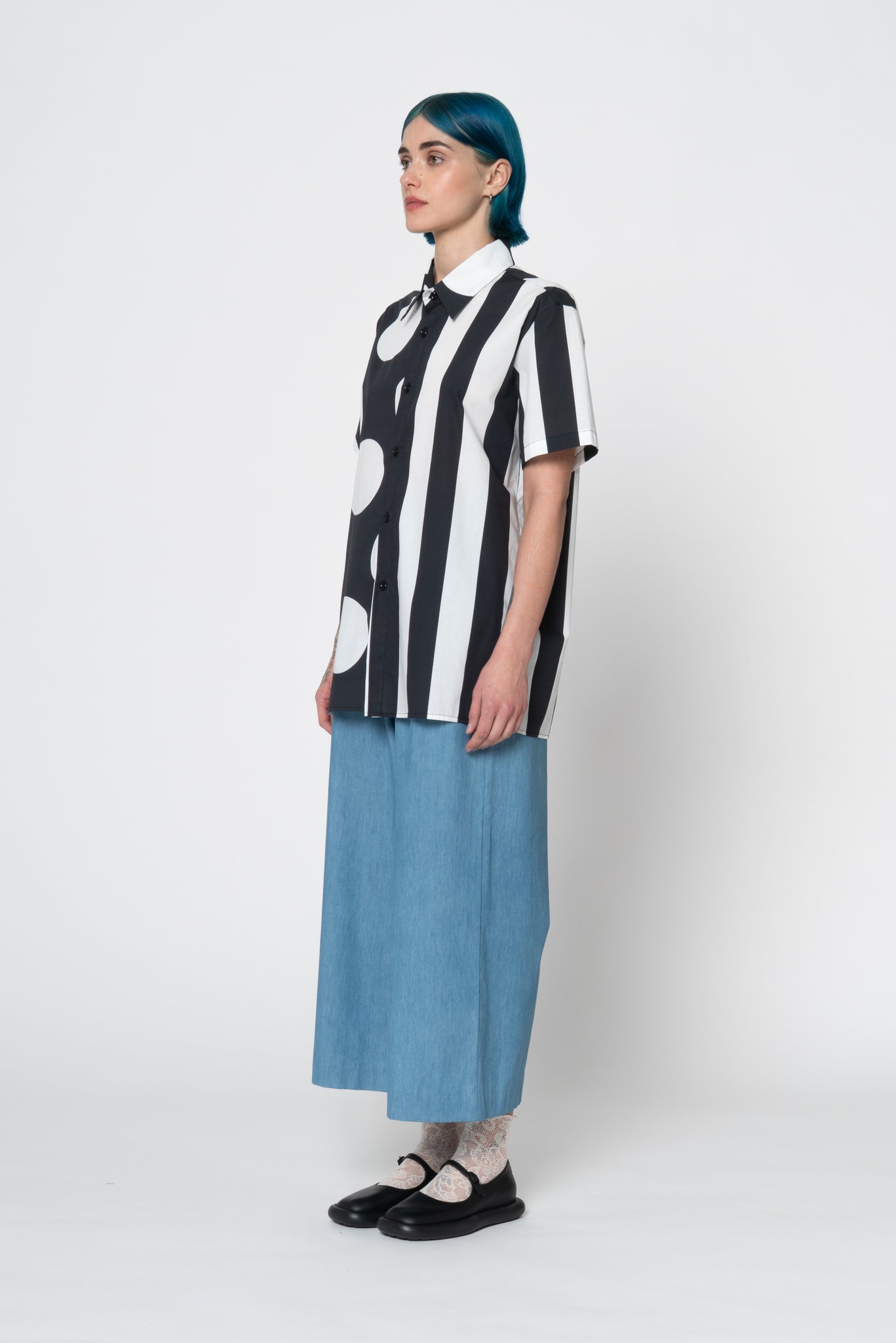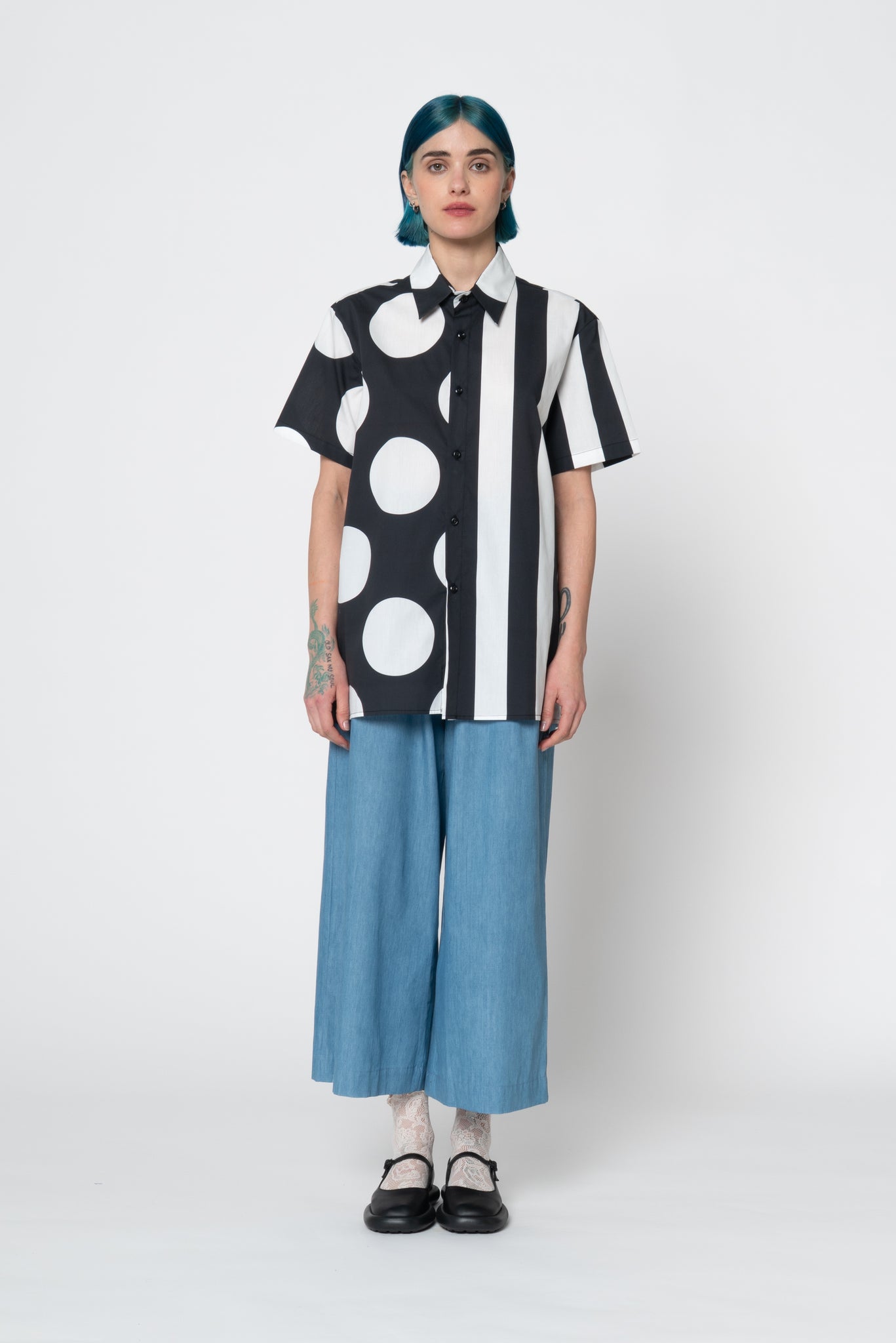Unisex printed cotton shirt. Straight bottom edge. Comfy fit. Made of 2 different prints, giant stripes and dots. The size S fits properly as an S for men. Oversized fit for women and regular fit for men. Iva in the picture is a 34 Eu size and wears a size S.