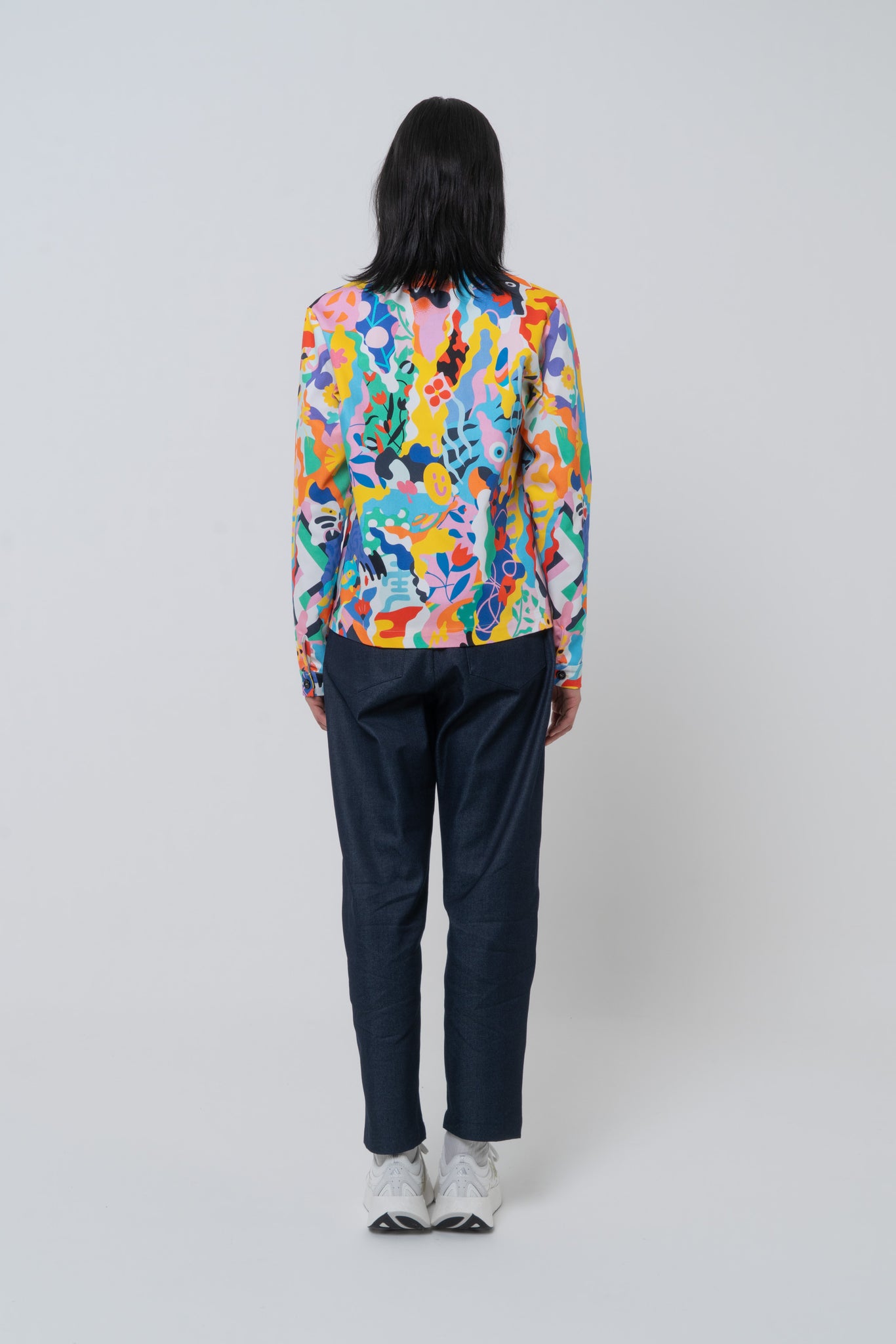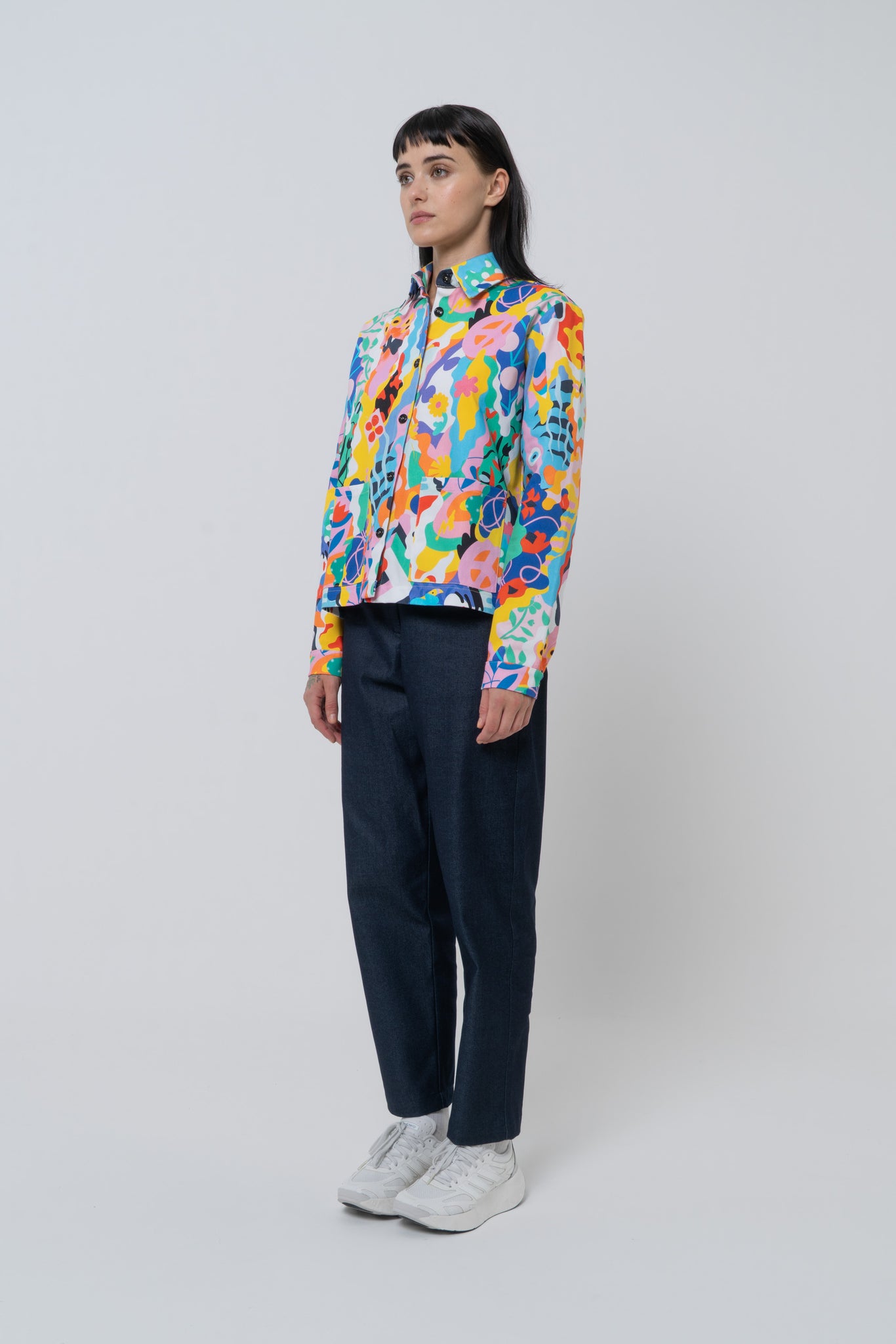 Heavy denim shirt jacket with pockets. Straight bottom edge and big buttons. Cuff with buttons and cropped style.