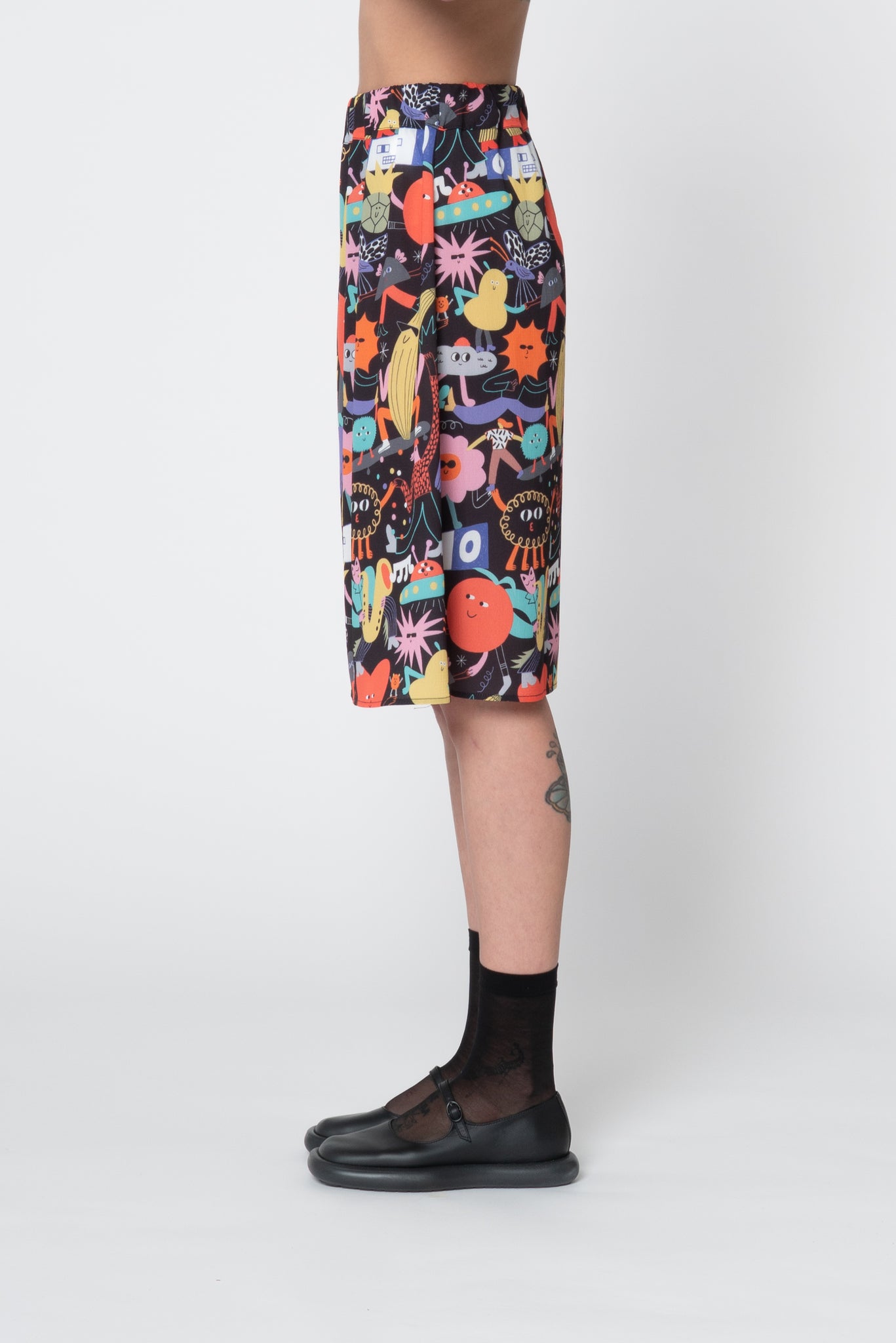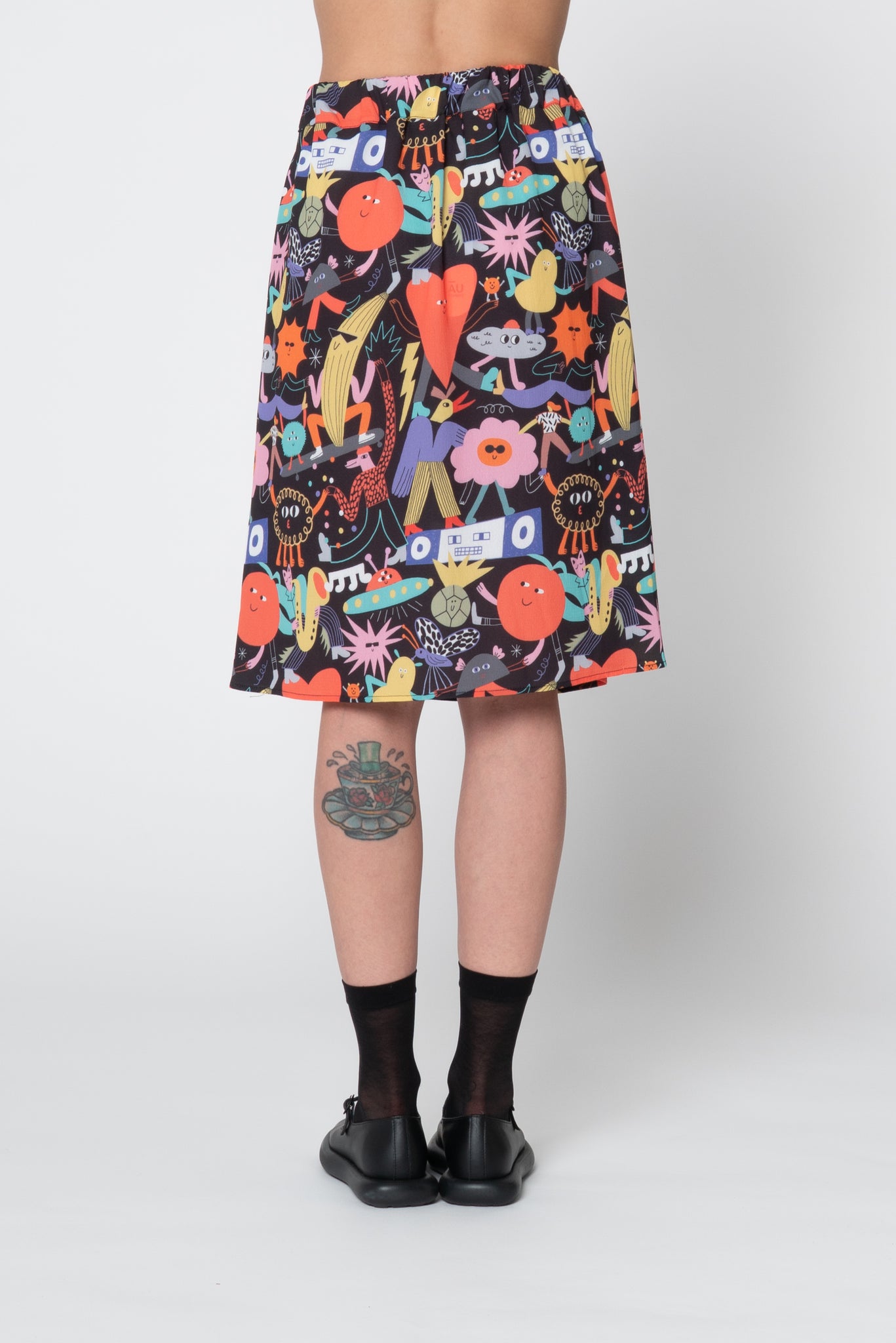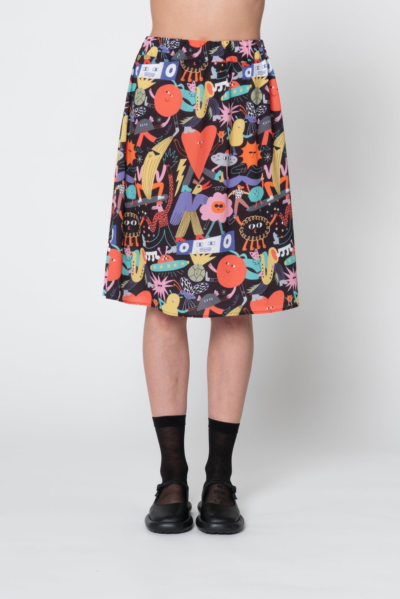 Slightly flared skirt made of a fresh and light georgette. High elastic belt. Print design by Dans Les Dents.