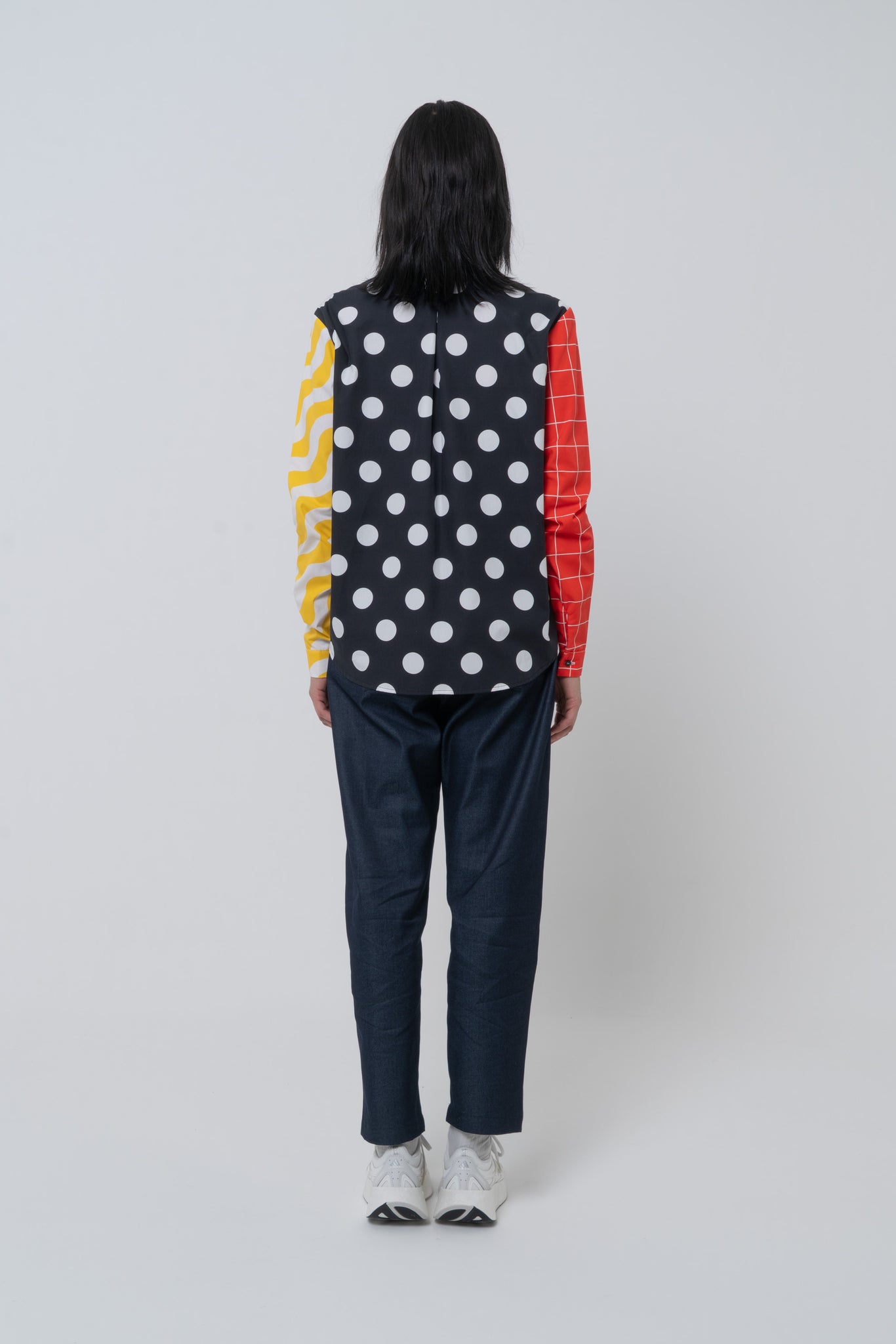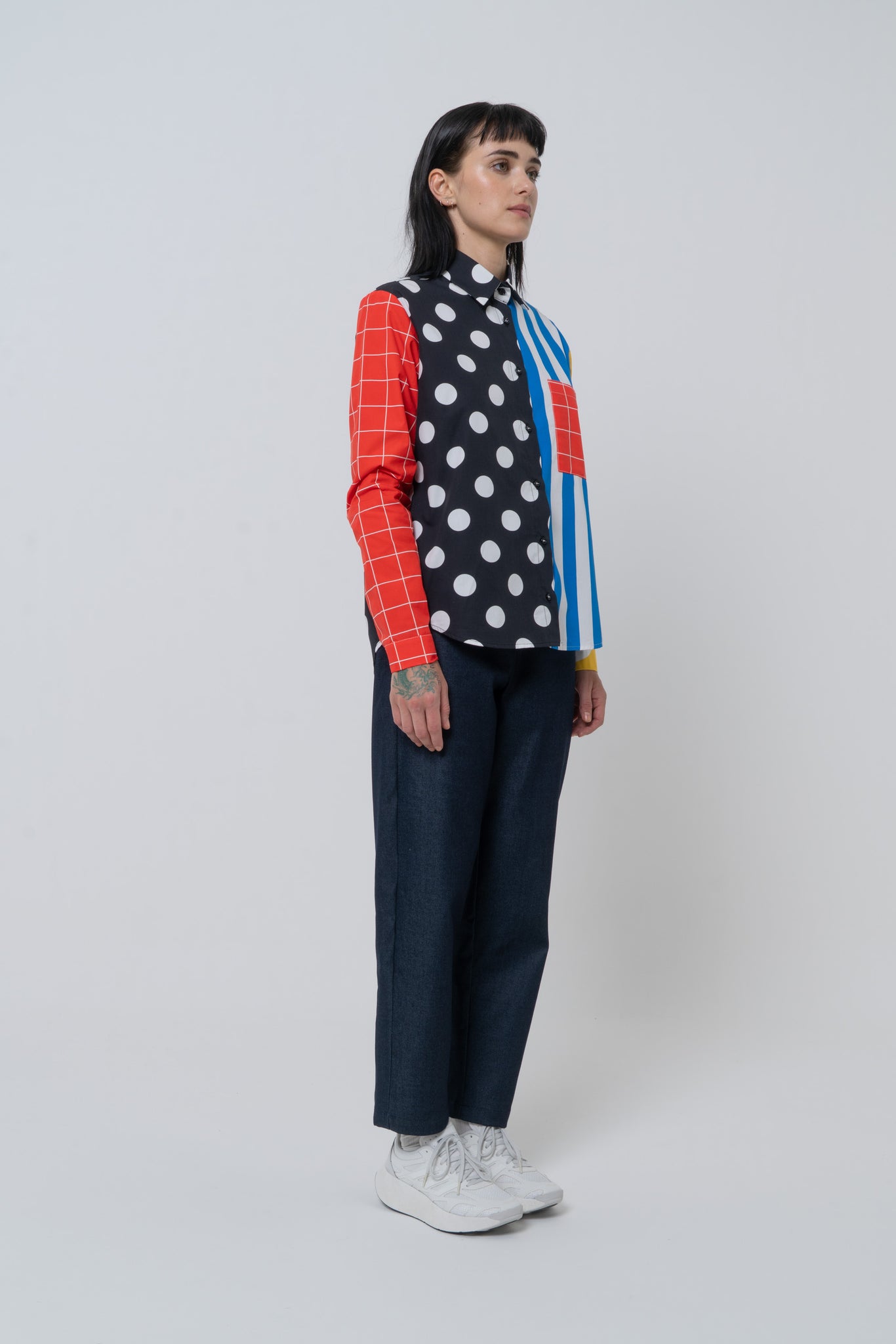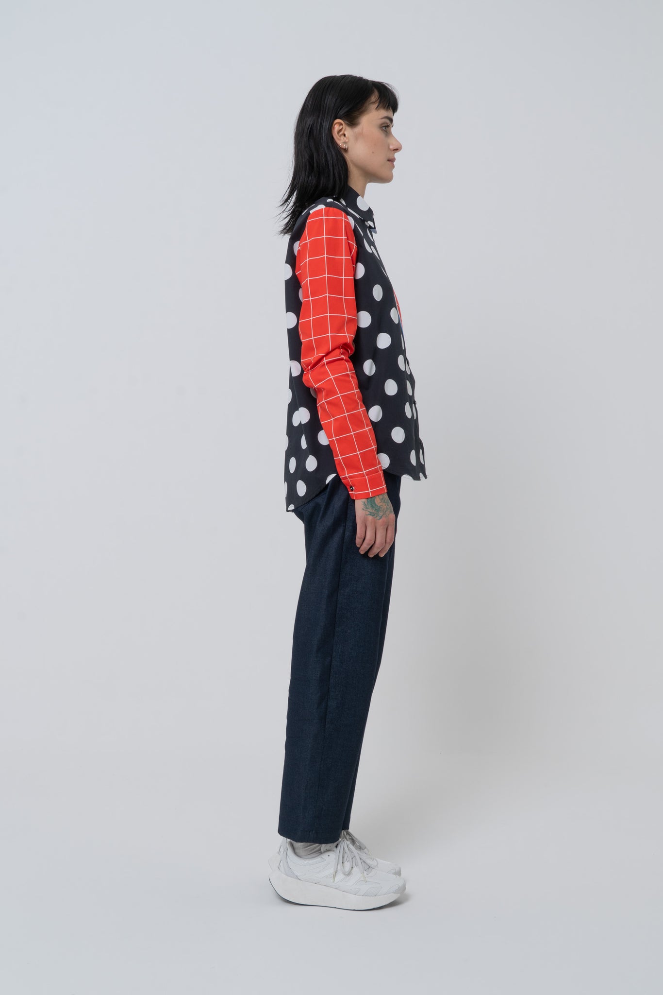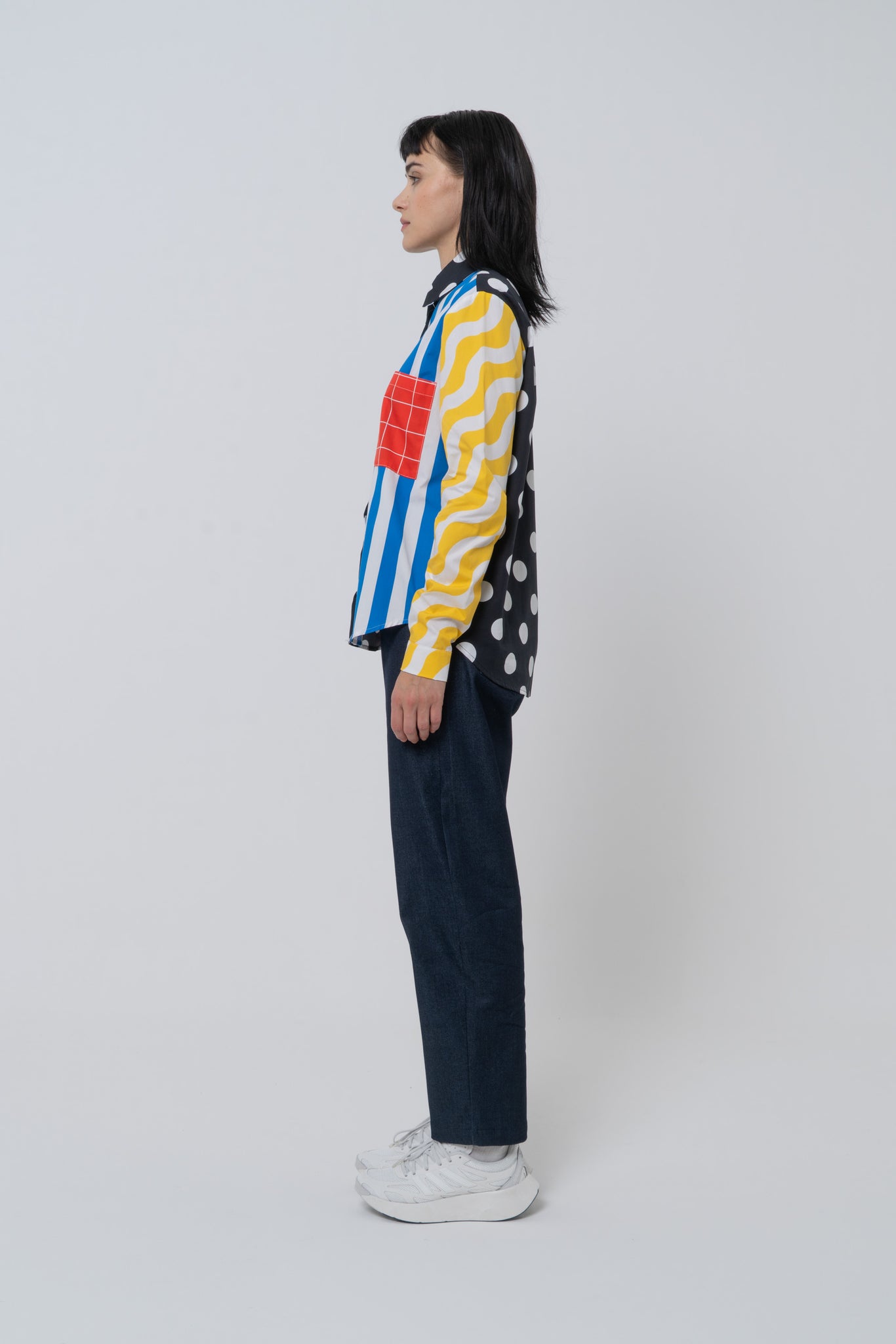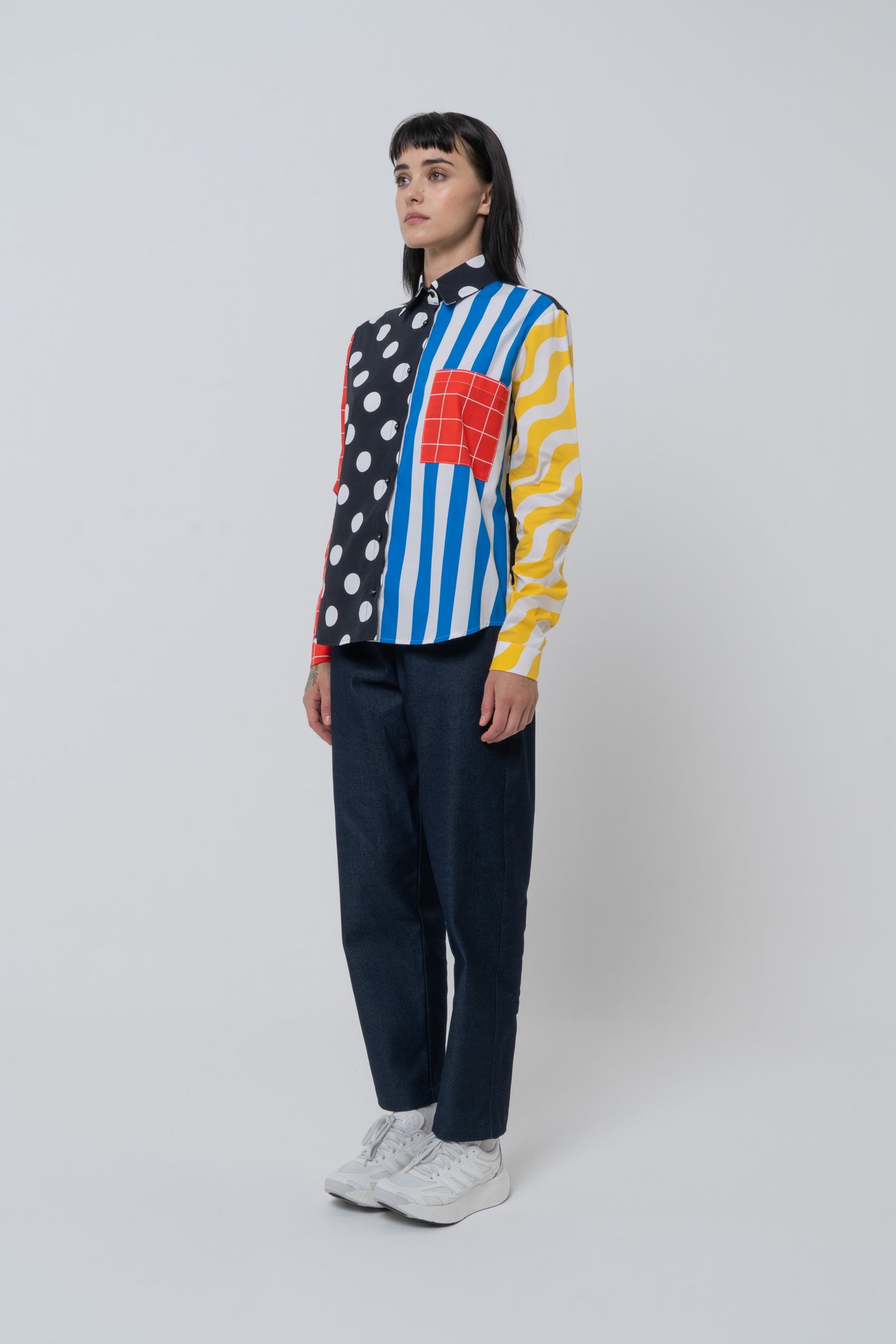 Printed cotton shirt with slightly dropped shoulder. Pince on the back side in the middle of the shoulders. Shaped bottom edge. Print design by LĀU Clothing, ABC serie.