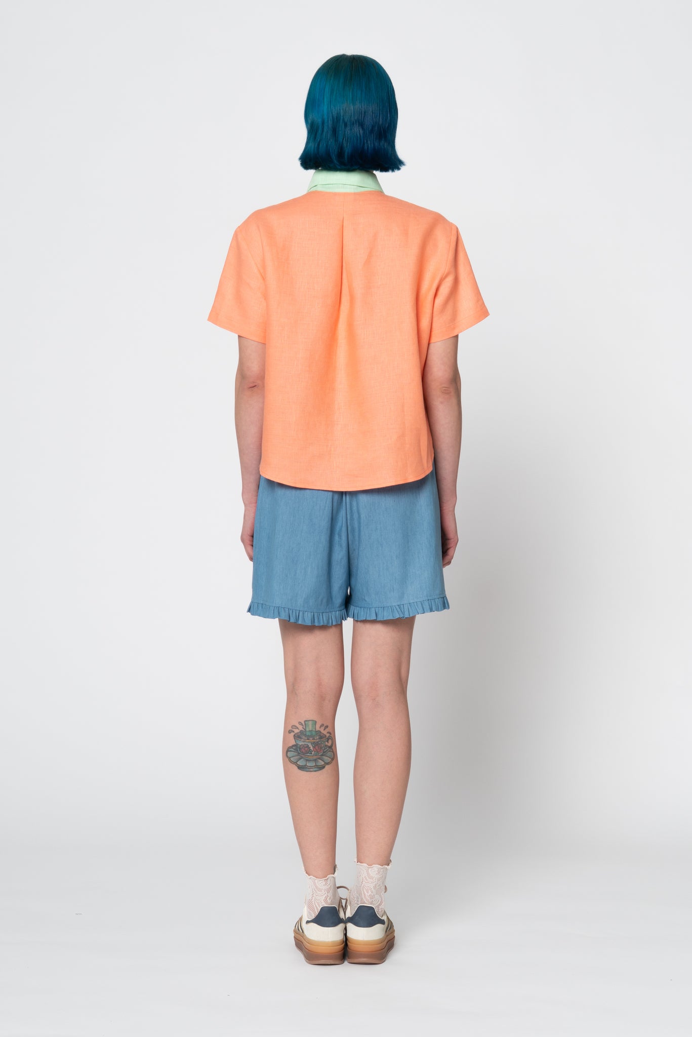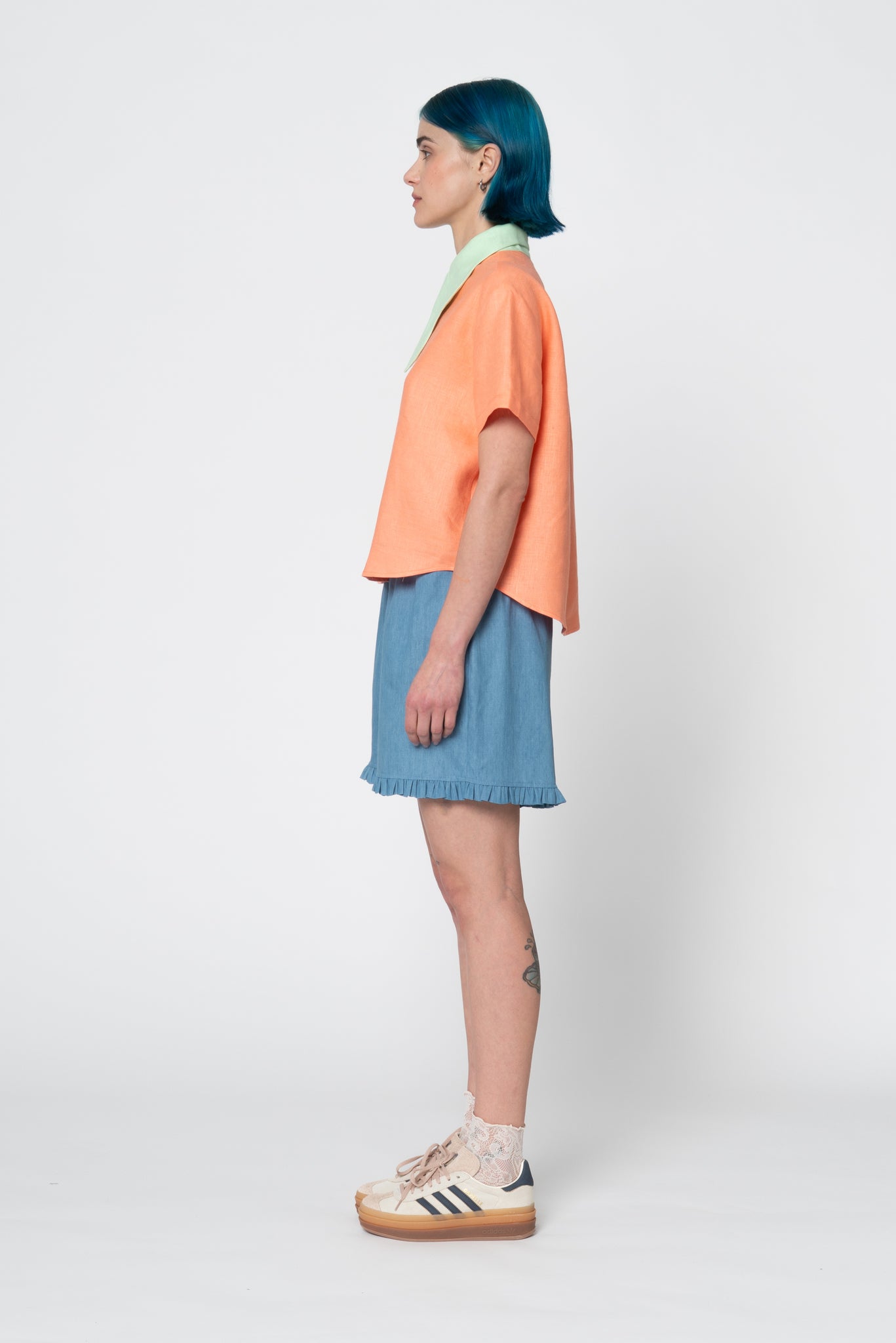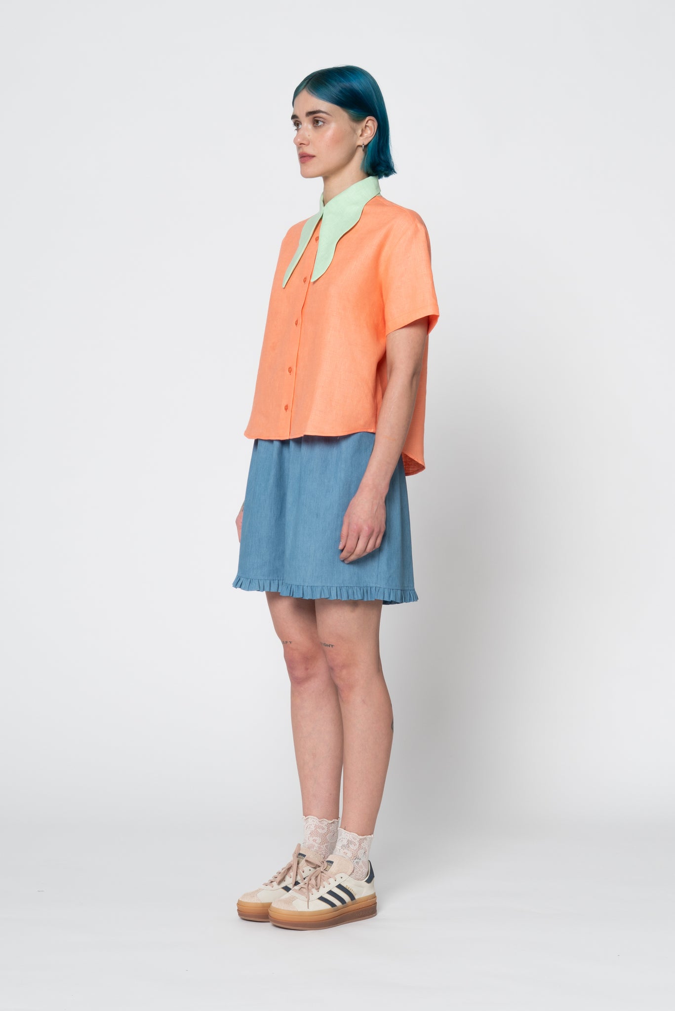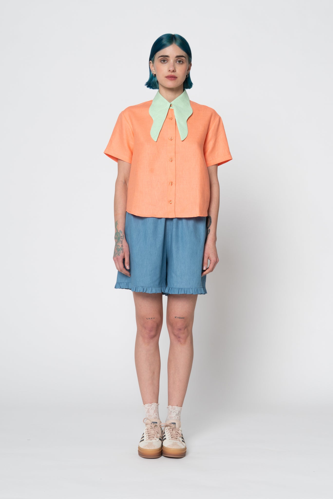 Fruity cropped shirt with a wavy collar that resembles a leaf. Shaped bottom edge and a pince on the center of the back. Limited edition.